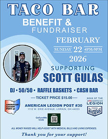 Feb. 22 4-9pm: Please help us support our Nathan Perry Chapter daughter Candi’s brother Scott, Commander of the Sons and Director of the American Legion Riders. (AML Post 30) who will be having surgery. To add to the Taco Bar Benefit, there will be a meat & freezer raffle! If you can't attend and want to help, please check out the gofundme that has been set up. Thank you again for your support.